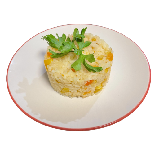рис пропаренный, кукуруза консервированная,морковь, перец сладкий, масло растительное, зелень