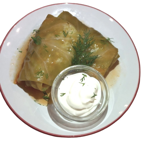 Капуста б.к., филе птицы, свинина, лук, рис, перец, соль, томатная паста, морковь, сметана.