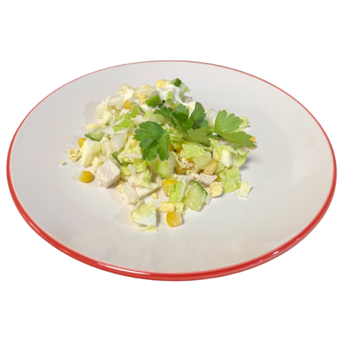 филе куриное, яйцо, огурец, салат зеленый, кукуруза консервированная., майонез, зелень