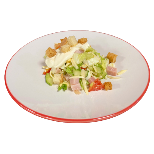 ветчина, салат зеленый, огурец, перец свежий, сыр, яйцо, гренки, специи, майонез